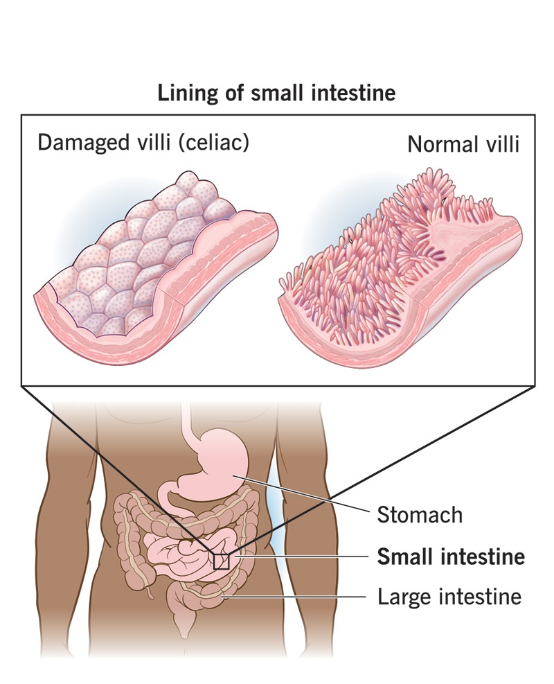 Mucosa (the lining of the small intestine) consists of many folds and projections (like fingers) called villi. The folds and projections help to absorb as many nutrients as possible during digestion. However, the body’s defense causes damage to the projections.