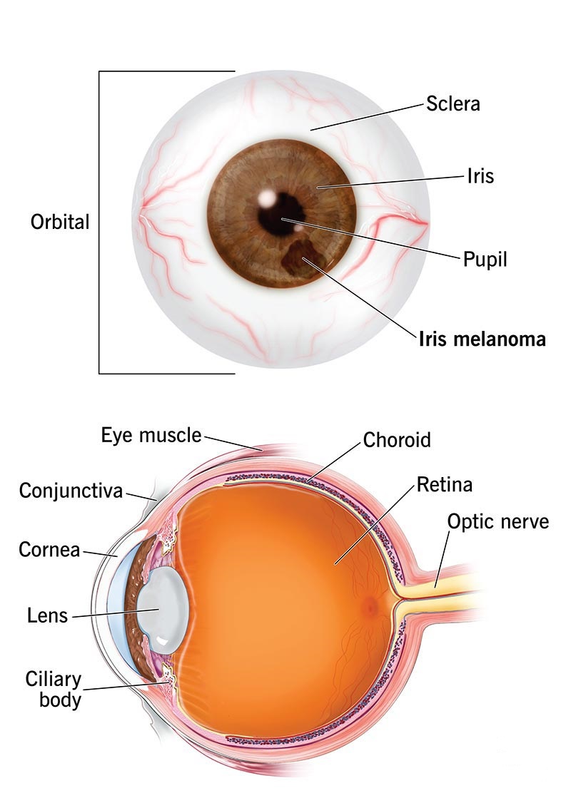 - Ciliary Body Melanoma β The ciliary body is behind your iris. The melanoma forms in the muscles that adjust the eyeball lens.