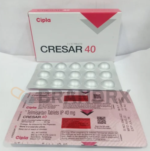 A tablet that is commonly used to treat hypertension (high blood pressure). Reducing hypertension helps to prevent strokes, myocardial infarctions, kidney problems, and others. Doctors may also prescribe this medication for other purposes not listed in this document. While the active ingredient of this medication is Telmisartan, it also contains other inactive ingredients such as magnesium stearate, meglumine, povidone, sodium hydroxide, and others. Cresar 40 mg belongs to a group of medications called angiotensin II receptor antagonists. Telmisartan works by relaxing the blood vessels, which helps blood flow more easily.