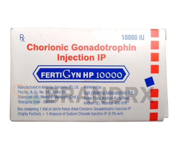 An injection that is used to treat infertility in women. It is also beneficial in the treatment of hypogonadism (delayed puberty, low sperm count). The active ingredient of this medication is Human Chorionic Gonadotropin (hCG). Nonetheless, it contains other inactive ingredients such as hydrochloric acid, water, benzyl alcohol, and others. Fertigyn 10000 IU belongs to a group of medications called Gonadotropins. Do not administer this injection alone at home.