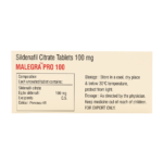 Malegra Pro 100 mg tablets can help you treat erectile dysfunction (ED) or help if you don’t have a strong erection. Using these pills you can improve your sexual life and restore your erection capabilities. It is recommended to take these pills only if you are suffering from ED disorders because in other cases you may experience unwanted results or even severe side effects. While Sildenafil Citrate is the main active ingredient, Malegra Pro 100 mg contains other inactive ingredients such as microcrystalline cellulose, calcium phosphate, and others. Sildenafil is a PDE-5 enzyme inhibitor. By inhibiting this enzyme, it increases the flow of the blood through the vessels in the penis.