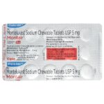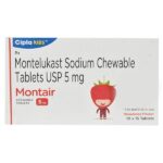 Montair Chewable 5 mg is a medicine that is usually used to prevent and control some symptoms (such as coughing, wheezing, and trouble breathing) due to asthma. This medication may help to prevent bronchospasm and breathing problems during exercises. Physicians may also prescribe this medicine to relieve symptoms of allergic rhinitis (such as stuffy, itchy, runny, and sneezing nose) and hay fever. If you are experiencing breathing problems or an asthma attack, do not use this medicine. In such cases, it is recommended to use a quick-relief inhaler such as albuterol. While the active ingredient is Montelukast, it also contains other inactive ingredients such as hydroxypropyl cellulose, croscarmellose sodium, magnesium stearate, aspartame, mannitol, and others. Montair Chewable 5 mg belongs to the group of medications called leukotriene receptor antagonists (LTRAs). Montelukast works by blocking the production of a certain natural substance that may worsen or cause asthma or allergies. Therefore, by decreasing the inflammation (swelling) in the airways, it helps to breathe more easily.