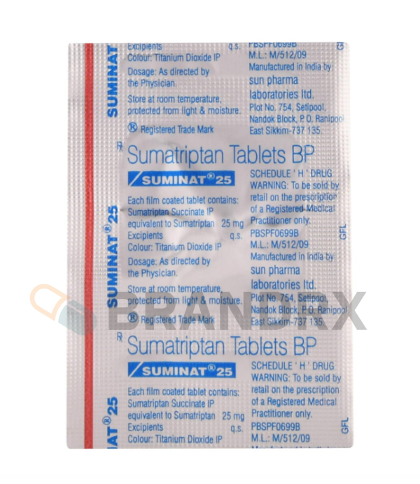 A tablet that is used to treat migraines. It also may be used to relieve pain, headaches, and other migraine symptoms such as sensitivity to sound or light, vomiting, nausea, and others. Suminat 25 mg may decrease your need for other pain medicines. The active ingredient of this medication is Sumatriptan Succinate. It also contains other inactive ingredients such as lactose anhydrous, croscarmellose sodium, magnesium stearate, microcrystalline cellulose, and others. Suminat 25 mg belongs to the group of medicines called triptans. This medication may also help to relieve pain by affecting some nerves in the brain. Sumatriptan works by narrowing the blood vessels in the brain, which helps to relieve migraine symptoms. Suminat 25 mg does not decrease how often you get migraine attacks or future migraines.