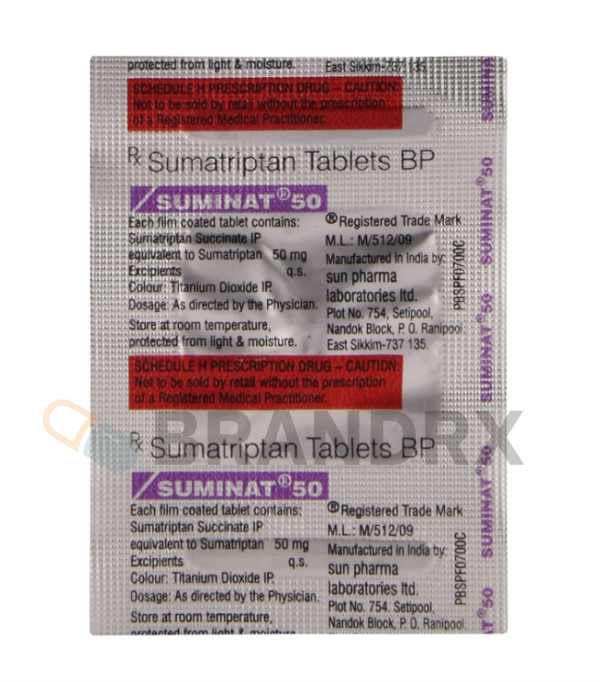 A tablet that is used to treat migraines. It also may be used to relieve pain, headaches, and other migraine symptoms such as sensitivity to sound or light, vomiting, nausea, and others. Suminat 50 mg may decrease your need for other pain medicines. The active ingredient of this medication is Sumatriptan Succinate. It also contains other inactive ingredients such as lactose anhydrous, croscarmellose sodium, magnesium stearate, microcrystalline cellulose, and others. Suminat 50 mg belongs to the group of medicines called triptans. This medication may also help to relieve pain by affecting some nerves in the brain. Sumatriptan works by narrowing the blood vessels in the brain, which helps to relieve migraine symptoms. Suminat 50 mg does not decrease how often you get migraine attacks or future migraines.
