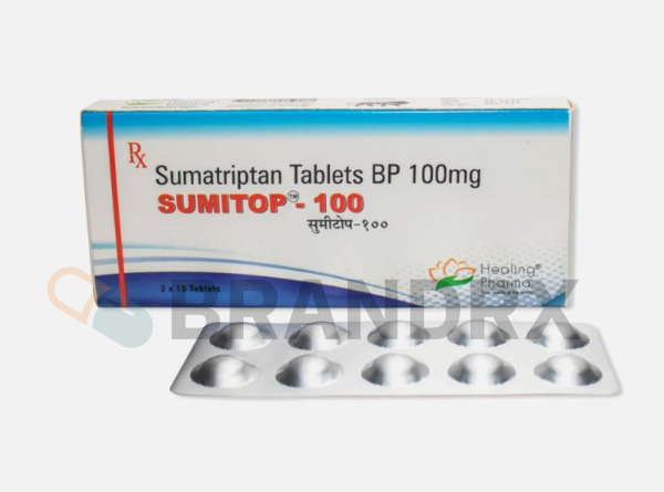 A tablet that is used to treat migraines. It also may be used to relieve pain, headaches, and other migraine symptoms such as sensitivity to sound or light, vomiting, nausea, and others. Sumitop 100 mg may decrease your need for other pain medicines. The active ingredient of this medication is Sumatriptan Succinate. It also contains other inactive ingredients such as lactose anhydrous, croscarmellose sodium, magnesium stearate, microcrystalline cellulose, and others. Sumitop 100 mg belongs to the group of medicines called triptans. This medication may also help to relieve pain by affecting some nerves in the brain. Sumatriptan works by narrowing the blood vessels in the brain, which helps to relieve migraine symptoms. Sumitop 100 mg does not decrease how often you get migraine attacks or future migraines.