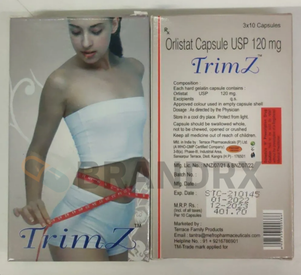 This medicine is usually used to manage weight control and treat obesity. Doctors may also prescribe this medication for other purposes not listed in this article. Trim Z 120 mg belongs to the class of drugs called Lipase inhibitors. Trim Z 120 mg works by blocking the enzymes responsible for the breakdown of fat. The active ingredient of this medicine is Orlistat. Nonetheless, it also contains other inactive ingredients such as hypromellose, magnesium stearate, microcrystalline cellulose, titanium dioxide, talc, polysorbate, and others.