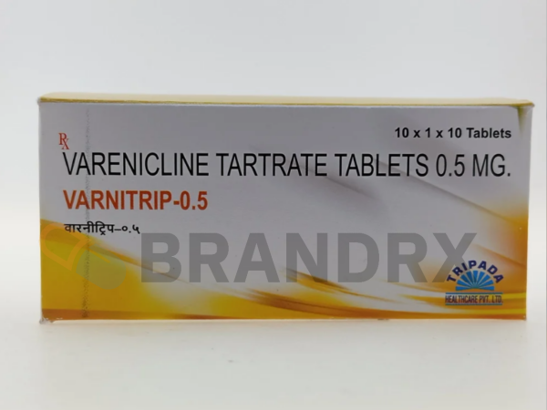 A tablet that is used to help people to quit smoking. Usually, the treatment lasts 12 weeks. This medication helps relieve withdrawal symptoms and cravings associated with stopping smoking. In the first two weeks of treatment with this medication, maybe you will continue to smoke. However, between 10 and 14 days, most patients set their quit date of smoking. While the active ingredient is Varenicline, Varnitrip 0.5 mg contains other inactive ingredients such as calcium hydrogen phosphate, magnesium stearate, microcrystalline cellulose, and others. Varenicline belongs to the class of medications called partial cholinergic nicotinic agonists.