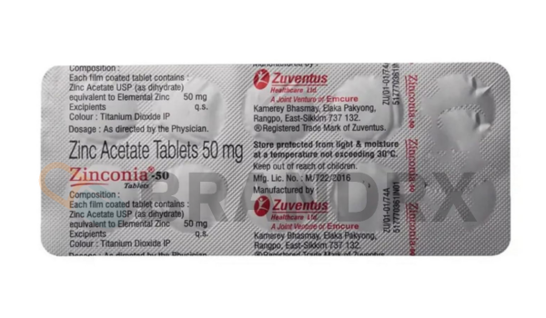 Zinconia 50 mg contains Zinc Acetate USP as an active ingredient. Zinc is an important component in various body enzyme functions. It also improves the immune system and helps in the treatment of flu and cold symptoms. In addition, this product also contains some inactive ingredients such as titanium dioxide, and others.